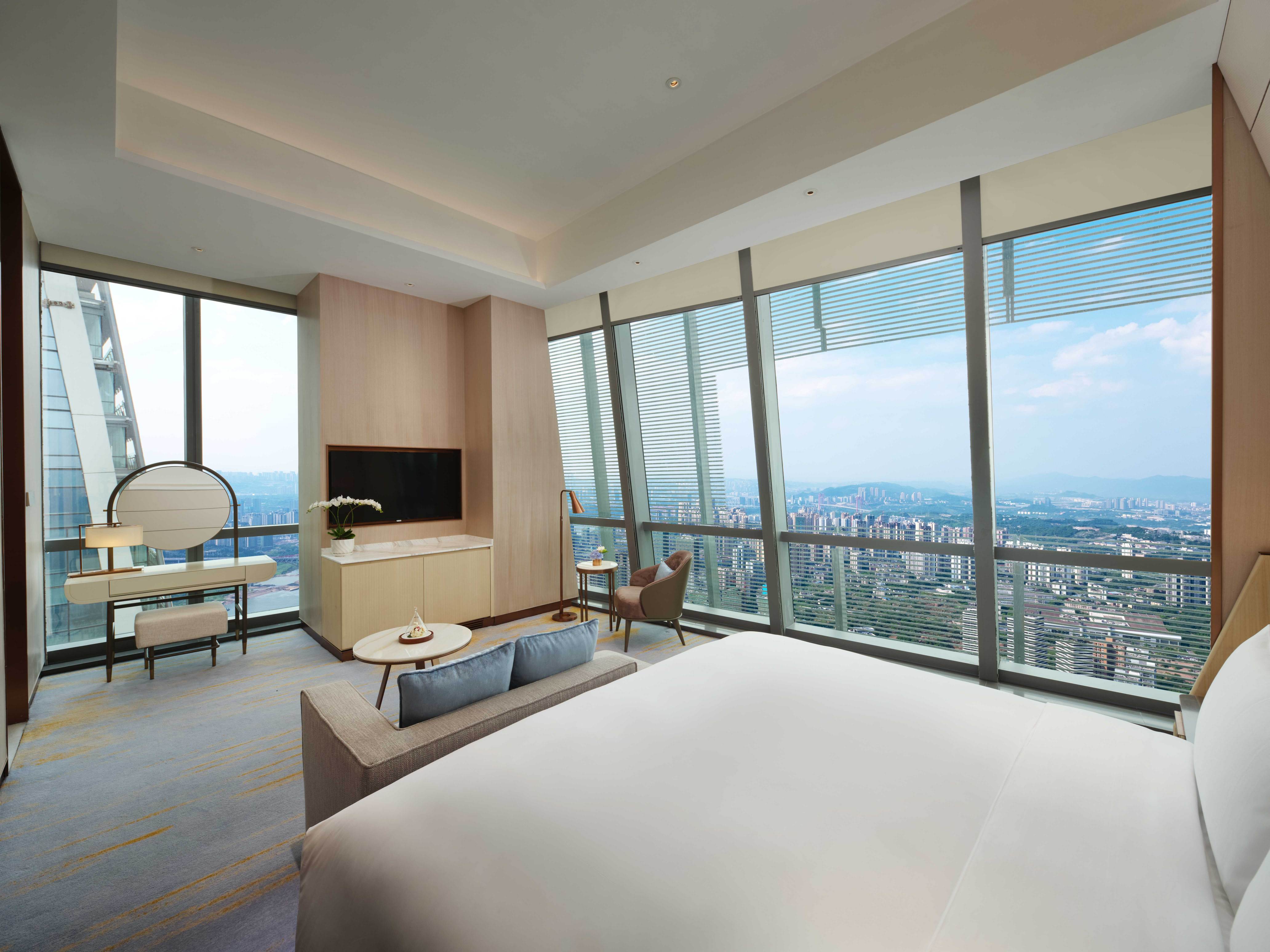重庆来福士洲际酒店拥有380间精心设计的客房及套房,客房内饰 融合了豪华游轮客舱的概念,与洲际酒店的整体设计理念 相呼应,灵动优雅。流线型的床体设计,甄选高档 亲肤床品,伴您一夜安睡好眠。知名品牌浴缸和洗浴 用品,使人放松身心。重庆来福士洲际酒店全景落地窗坐拥朝暮江水奔流 和都市繁华盛景,营造出奢华雅致的休憩空间。 每间客房均配备: 智能电视点播系统,电动窗帘,蓝牙音响,手机无线充电设施,咖啡机,独立浴缸及步入式淋浴间,智能马桶及戴森吹风机。